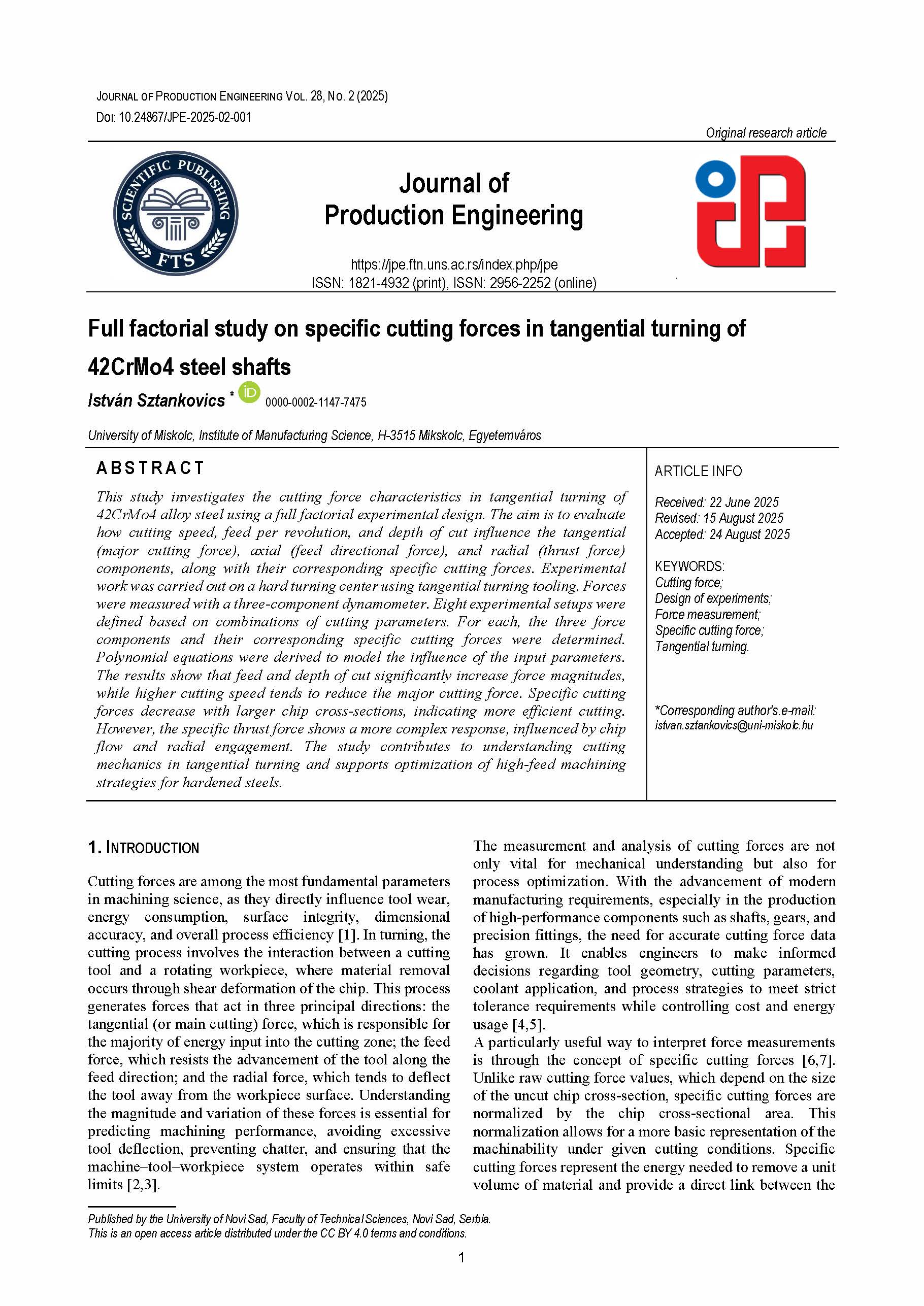 - Aleksić, A., Sekulić, M., Gostimirović, M., Rodić, D., Savković, B., & Antić, A. (2021). Effect of cutting parameters on cutting forces in turning of CPM 10V steel. Journal of Production Engineering, 24(2), 5–8. https://doi.org/10.24867/jpe-2021-02-005